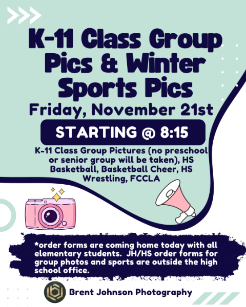 We are excited to announce we are partnering with Brent Johnson Photography for our Class Group and Winter Sports Pictures 📸 Grades Kindergarten thru 11 will take a class group photo this Friday, November 21st. Order forms are coming home today with all elementary students, are outside the high school office for the JH/HS students, and are also linked below. Please send your order form and payment (cash or check made out to Brent . . .